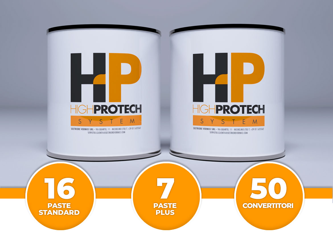Highprotech System è composto da: 16 paste standard, 7 paste PLUS per la massima precisione formulativa, e 50 convertitori neutri, mono e bicomponenti, in confezioni pre-pesate per ridurre il tempo di realizzazione della tinta e meno rifiuti da smaltire.
